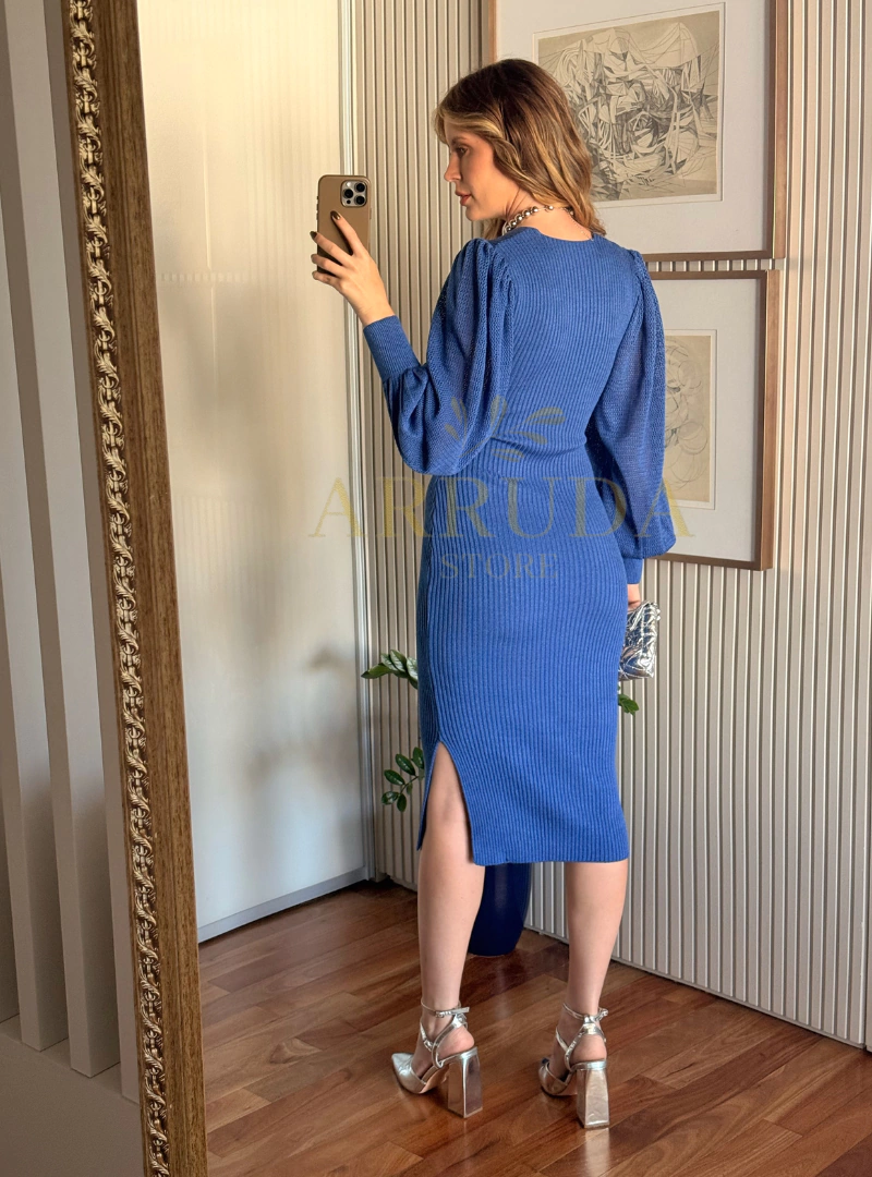 Vestido na cor azul confeccionado em tricot de trama canelada